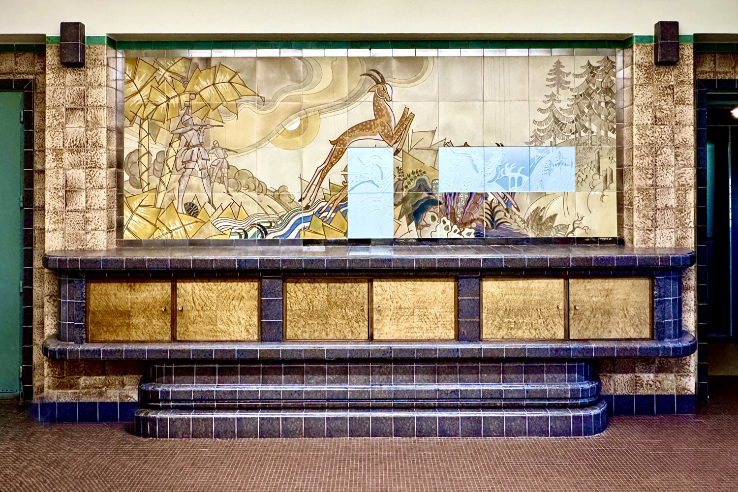 In the management office, wall furniture made of tiles and wood has been superbly restored according to the original plans.