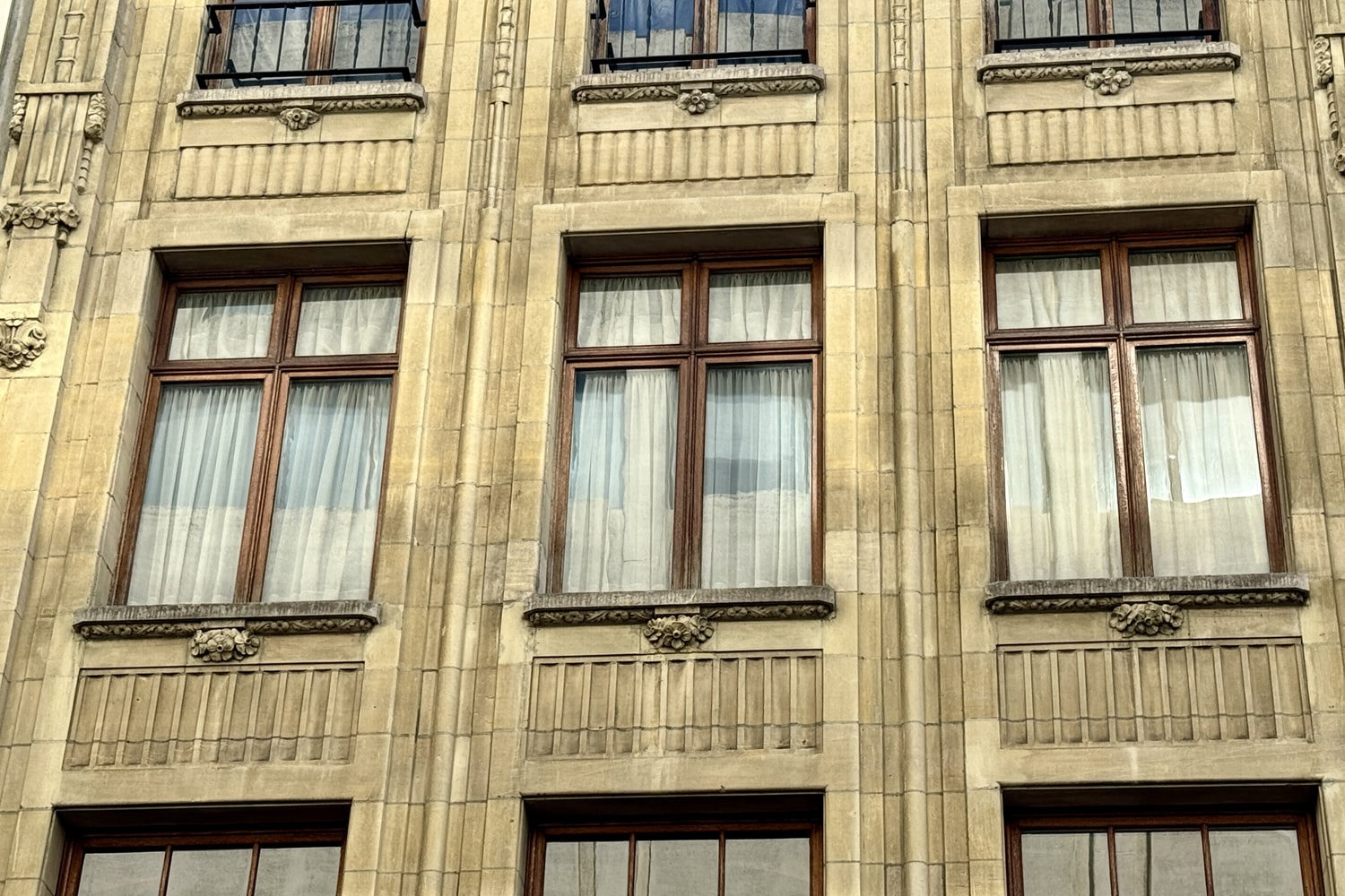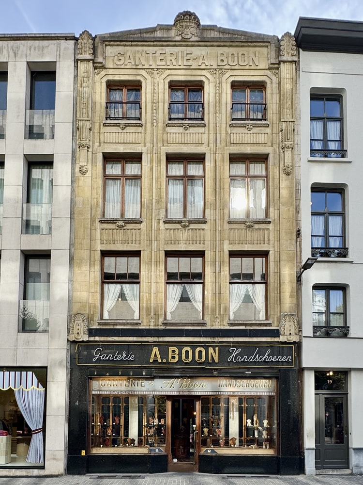 Talrijke decoratieve elementen sieren deze gevel, zoals de gecanneleerde panelen tussen de ramen en op de tympana. De winkelpui heeft alle originele elementen behouden: het horizontale, met goud bedrukte glazen uithangbord, de centrale toegangsdeur en de symmetrische vitrines. Zelfs de presentatie van de handschoenen lijkt zijn jaren 30-stijl te hebben behouden.
