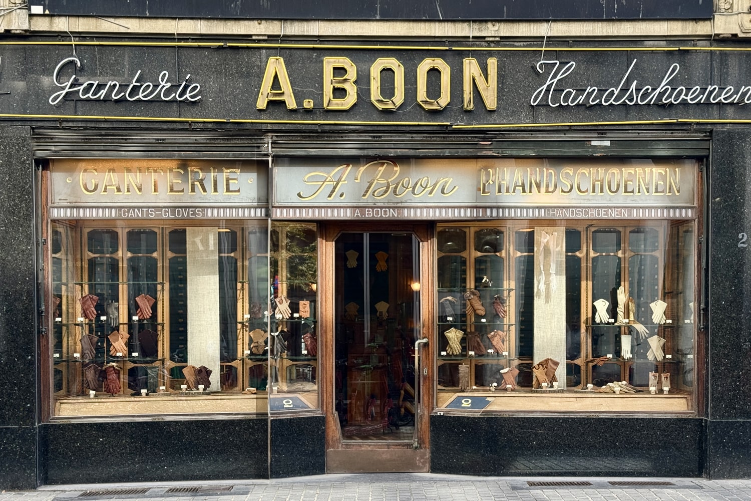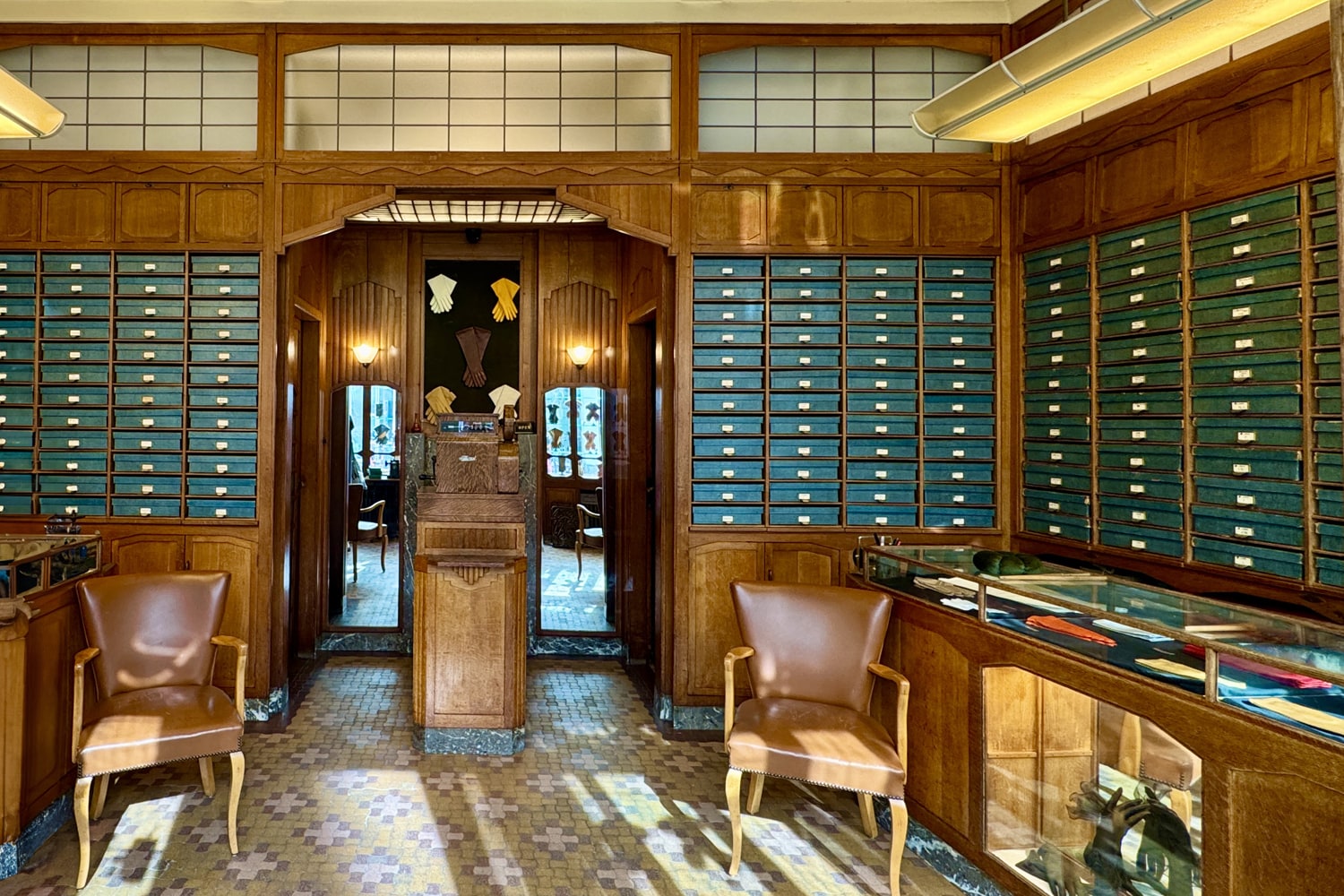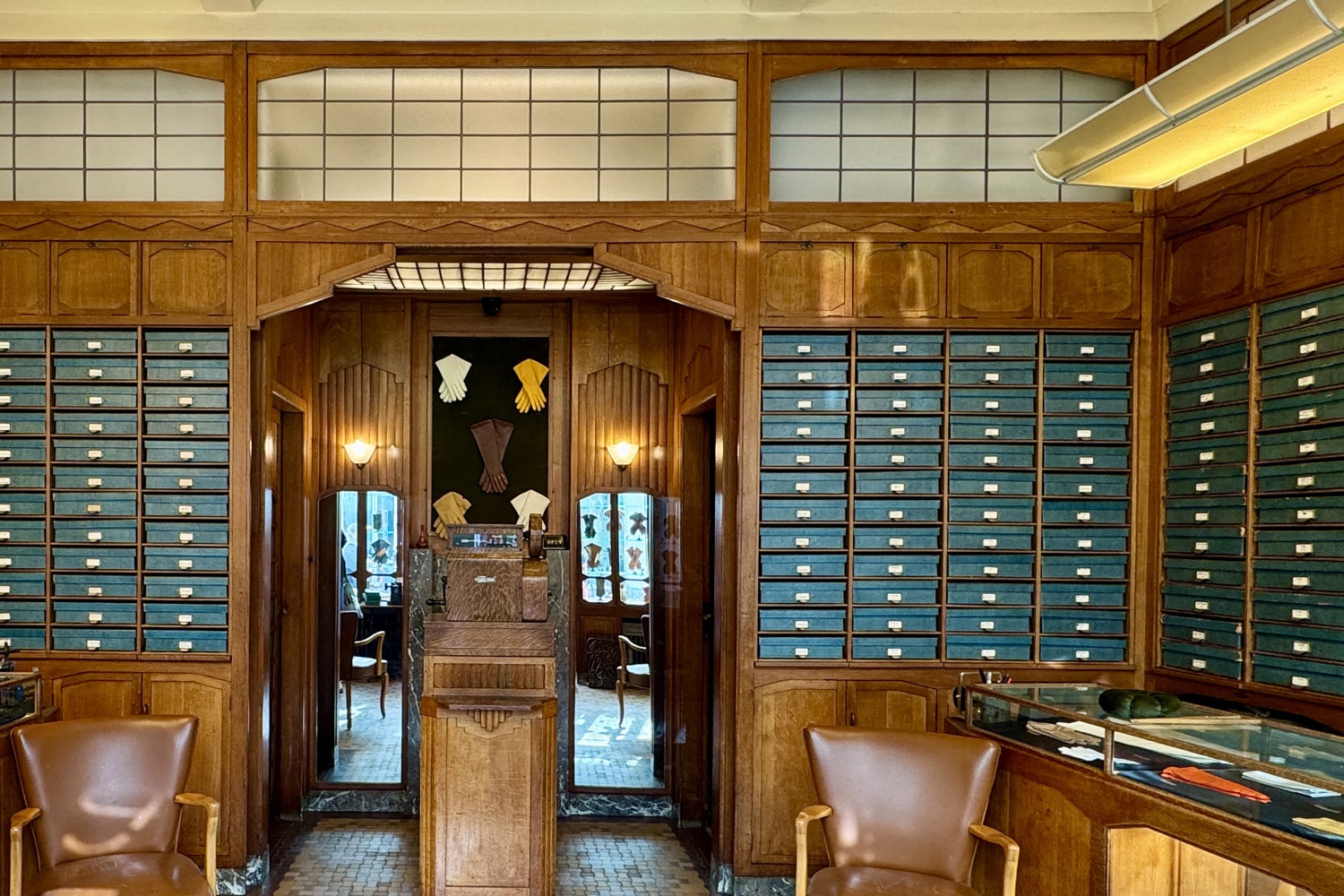 Het authentieke art-deco-interieur heeft geen veranderingen ondergaan; alles is verfijnd: het meubilair, de eikenhouten lambrisering, de tegelvloer en de marmeren open haard achter de authentieke kassa van «faux bois ». Twee elegante toonbanken staan tegenover elkaar onder kroonluchters van melkloodglas. Turquoisekleurige lederen dozen verbergen de handschoenencollecties. Een klein juweeltje om te ontdekken.